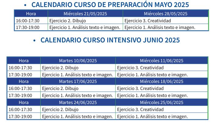 - Clases presenciales sobre los 3 ejercicios que componen la prueba.